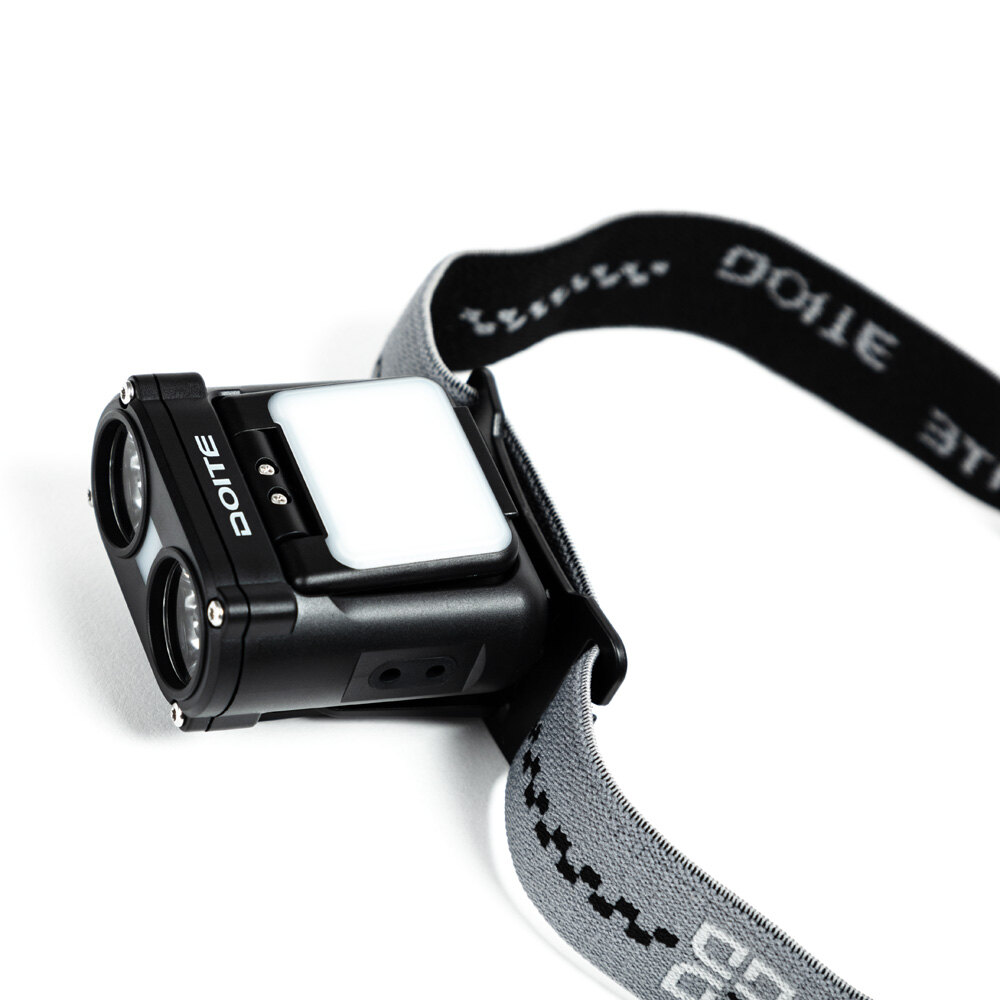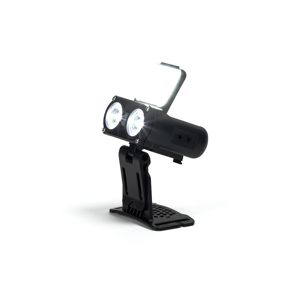 Særdeles fleksibel hodelykt. Har stativ så den kan stå og lyse. Eget LED topplys. Har bevegelsessensor som gjør at du kan spare batteri når du sitter stille. Inkludert polstret oppbevaringseske og karabinkrok.